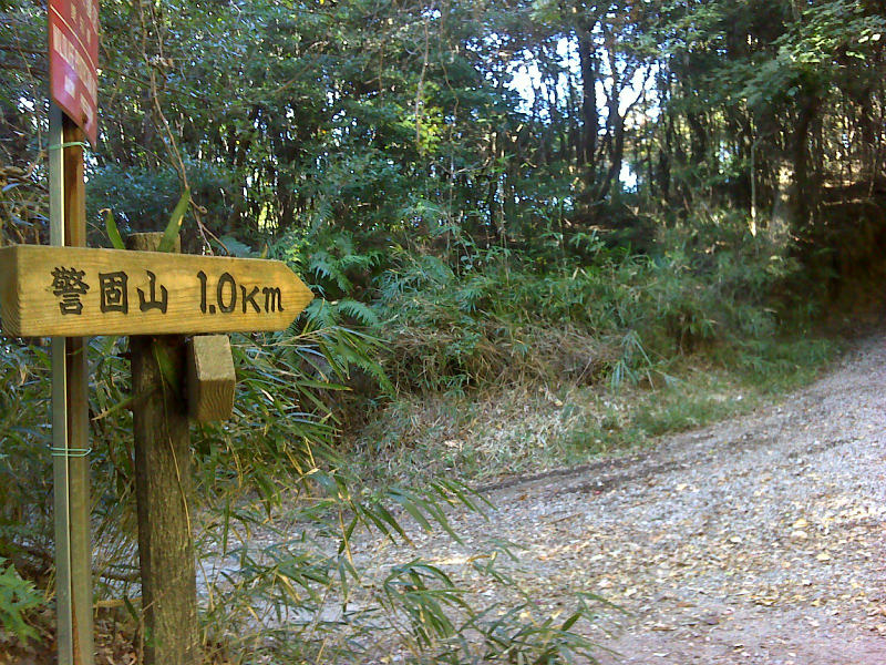 この自然公園から武豊町最高地点の警固山83.6mへと向かうことができる。 道も里山の尾根伝いの未舗装の車道で面白い。途中にイチョウの真っ黄色に出会う。銀杏でも栽培しているのだろうか。 警固山は源頼朝が、野間で討たれた父義朝の供養の際、見張りの警護に使った山との伝説があるようで、それが山名の由来となっているようだ。