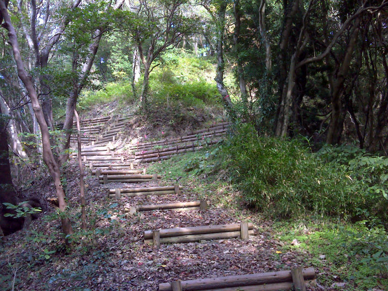 木で土留めされた急こう配の階段を下ったところで、電チャリをデポ。あとは歩きできつい階段を一気に上がると山頂に着いた。 低山なのであっけない。