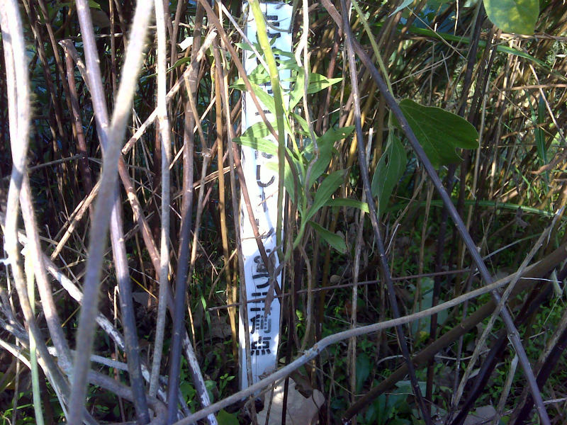 しかし、草ぼうぼうの三角点付近は必死で探したにもかかわらず。笹とツタの入り混じる場所で、よくある三角点を大事にしようという白い標柱と、昭和初期に建てられた「伊勢山頂上高峰」の石柱しか見つけられなかった。 GPSでは間違いなく踏んでいるのだが・・・・・。