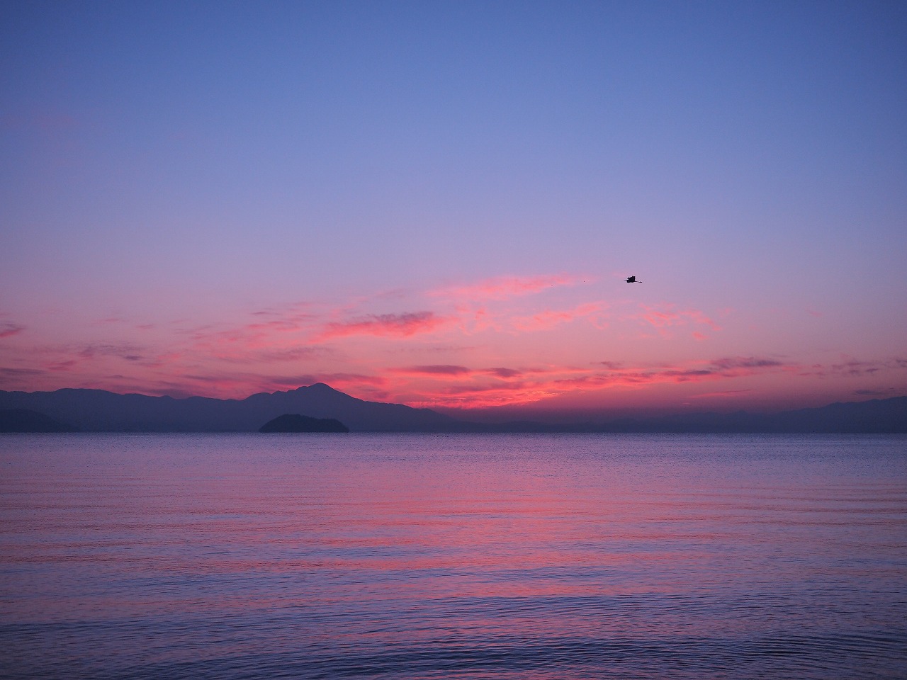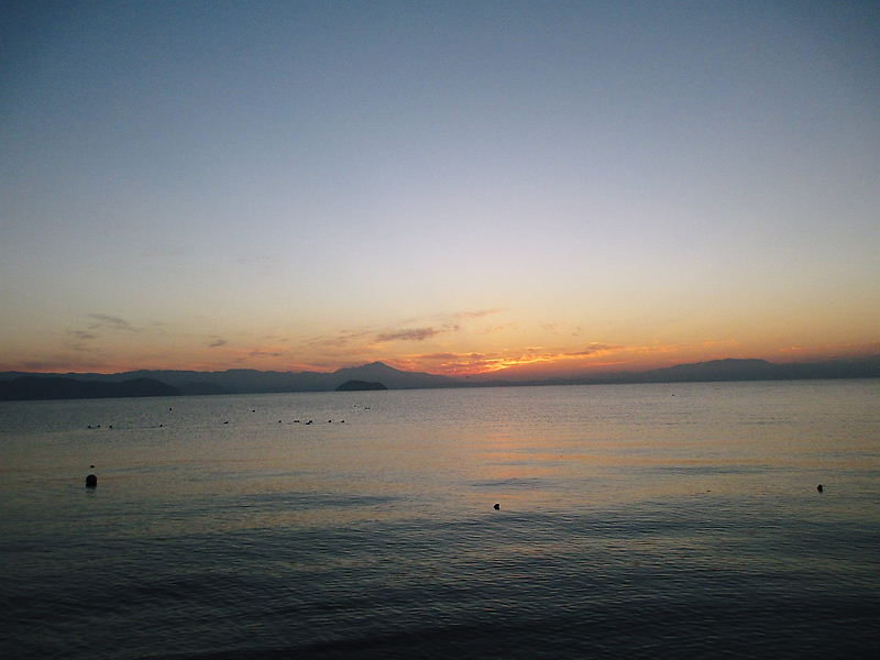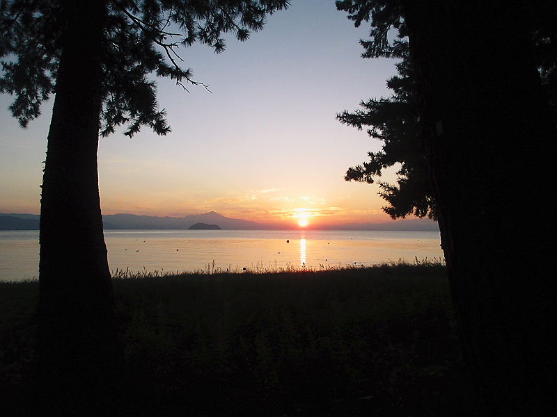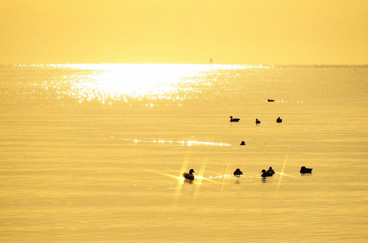 琵琶湖の夜明けは美しい。日の出前から空が赤く染まり、オレンジ色の太陽が顔を出すと湖面が色を変えながら煌めく。