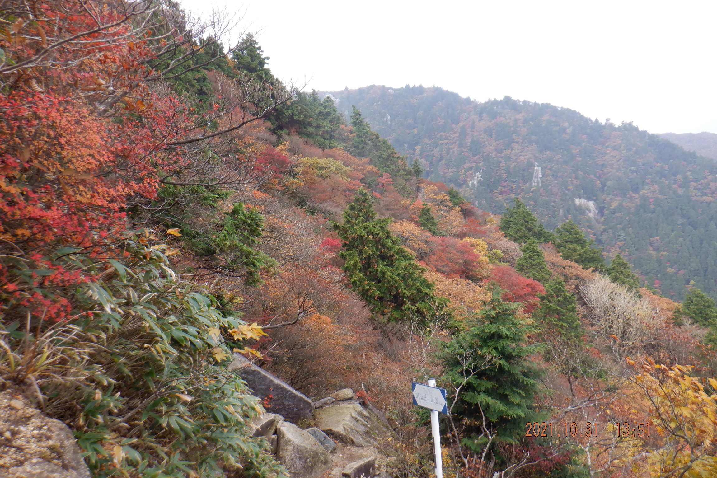 富士見尾根岩場を通過、眼前の紅葉が素晴らしい。