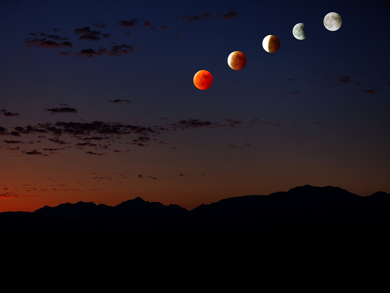 2枚目は、記憶を繋いでます。南アルプスの山稜に竜王で撮った月食の月いろいろを張ってみました。
