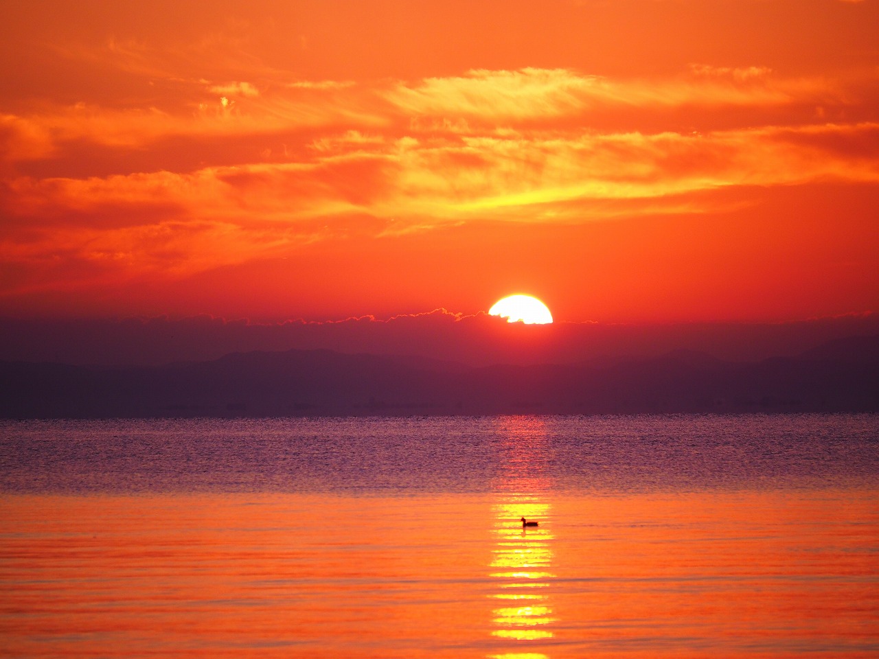 琵琶湖の夜明けは美しい。日の出前から空が赤く染まり、オレンジ色の太陽が顔を出すと湖面が色を変えながら煌めく。