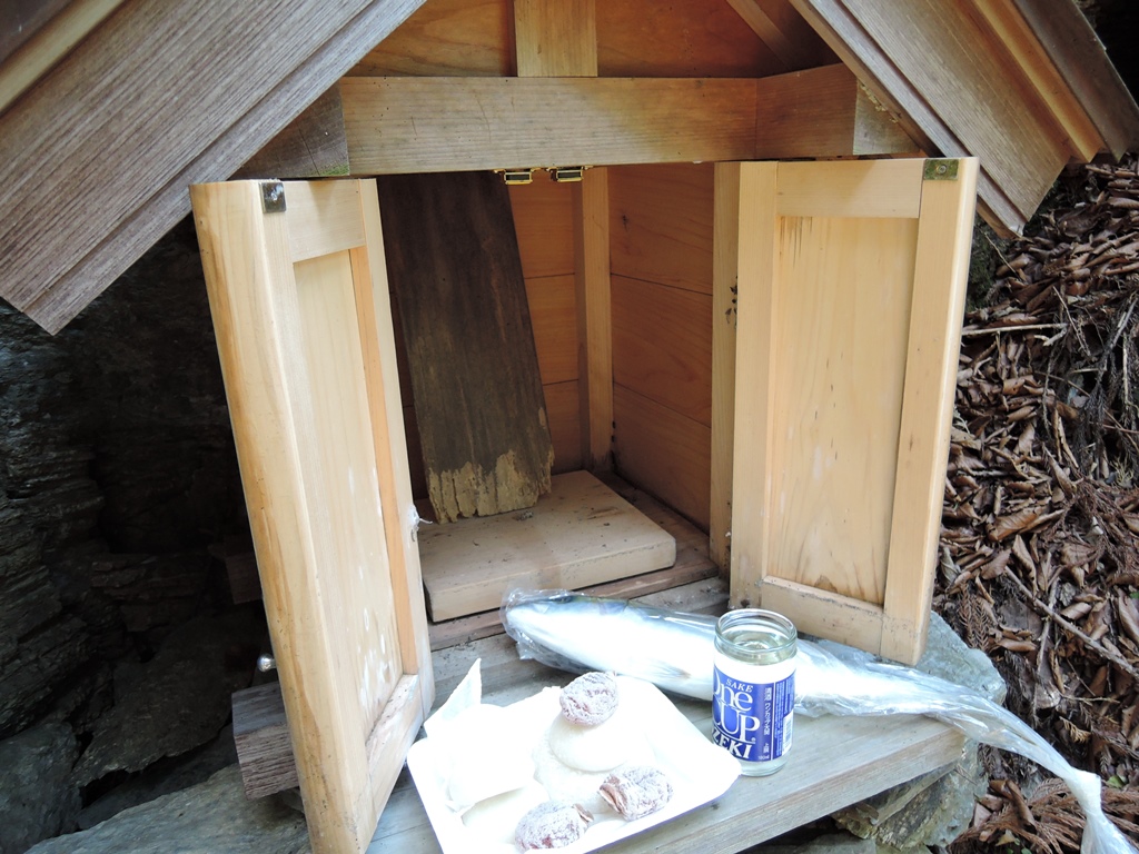 ヤッチャンきばったな、魚はハマチだ。『山の神』と『お不動さん』に1匹ずつ。先日信州で買ってきた干し柿も差し出す。「おおこれもええな。とりあえず御神酒飲め」ワンカップを渡される。ヤッチャンはスパっと飲み干す。「このお不動さんの板は何か書いてあったんですか?」「そやで・・けどショウチャンに聞かんとわからんなぁ」片付けも手早い。「さあ降りるで」