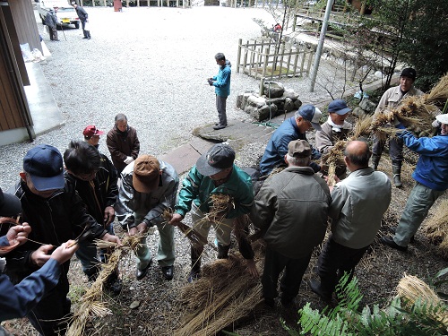 宮司さん(他の神社から来ているとのこと)の祝詞が終わると、やおら全員参加で『山の神』の前で注連縄を編み出す。社の前を横切るように7~8mくらい。