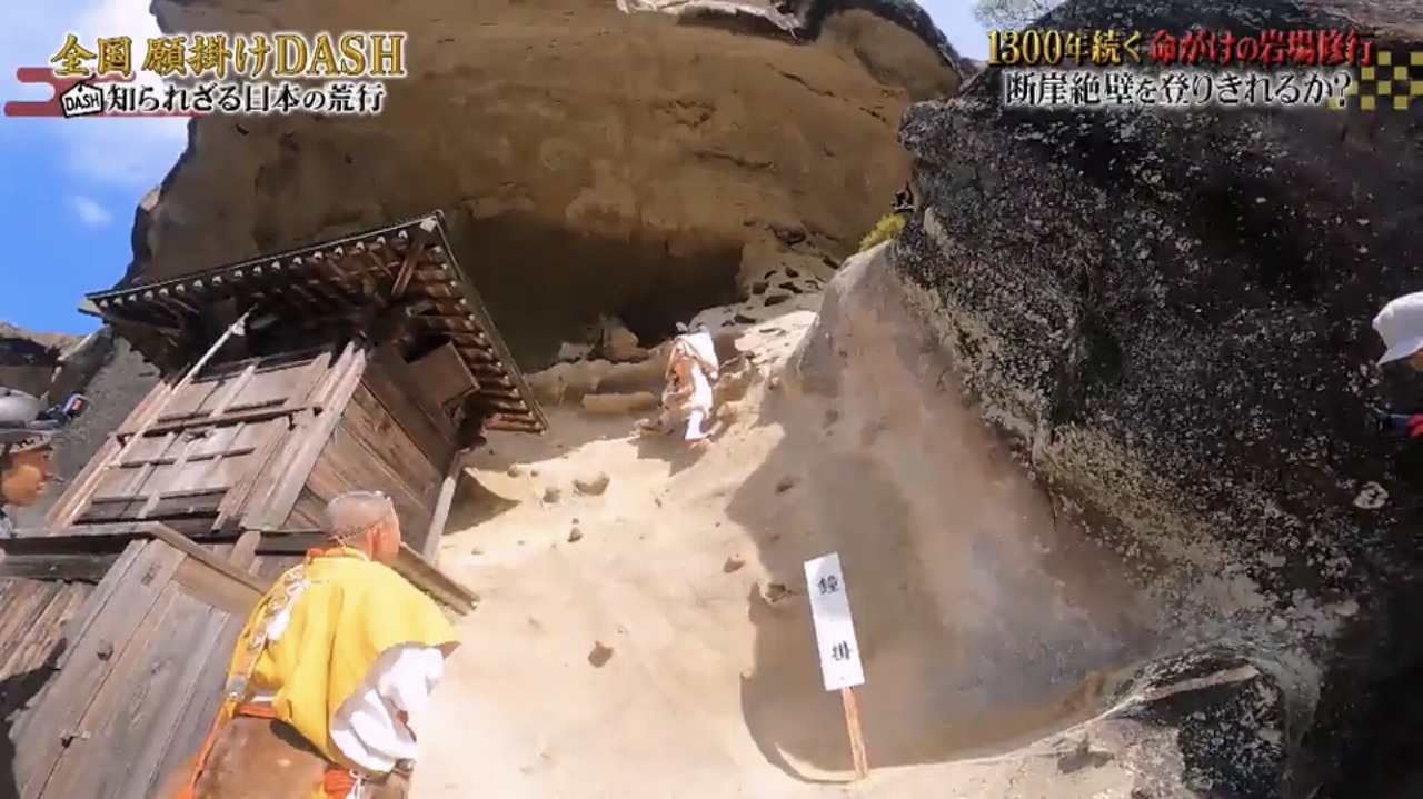 『鉄腕ダッシュ』で登った2人は、岩屋本堂の上に上がるときは、しっかりと確保されていました。