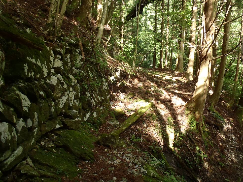 右岸に石積みが見えるので上がってみると、水平道が続いていた。