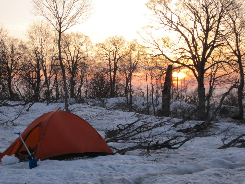 1100mを越えるともう一度急登になり、頂上直下でようやく雪が連なるようになってきます。1250mで尾根を右に回り込んで雪を背負いこんだブナオ山頂上に着きました。ここまで標準的なコースタイムで2.5時間くらいでしょうか…我々はここで幕を張ります。