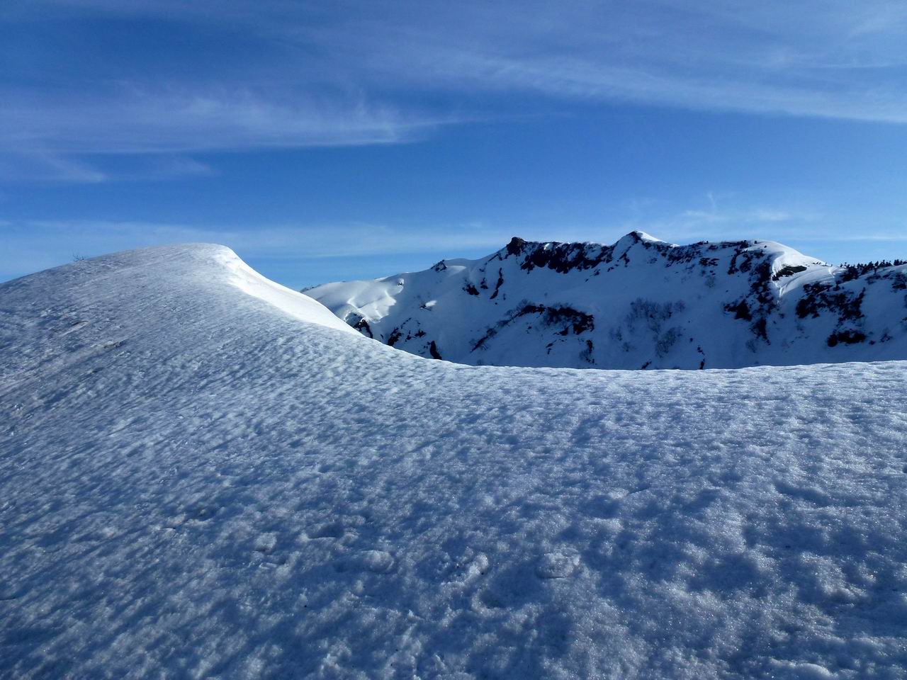 す。先行するトレースがなく、ツボ足で膝下くらいの沈み込みなので、まだ快適に歩くことができました。 鞍部からは、右に雪庇が出て