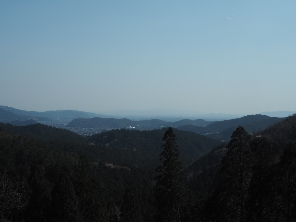 下山は山頂から南西に伸びる尾根を下る。この尾根を通るのは初めてであったが、意外にm随所に京都市街や比叡山の好展望が開ける。南斜面をトラバースする林道に出ると、林道と平行に走る檜の植林の尾根を辿って岩倉川沿い出る。岩倉の市街地に下ると、最後は岩倉川の川沿いでは桜が満開であった。
