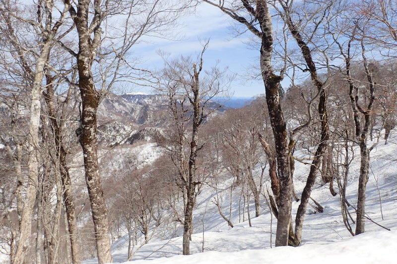 意外なほど展望のいいブナ林の尾根が続き、足取りも軽い。南側斜面には雪の台地が広がり、緩やかに上がって