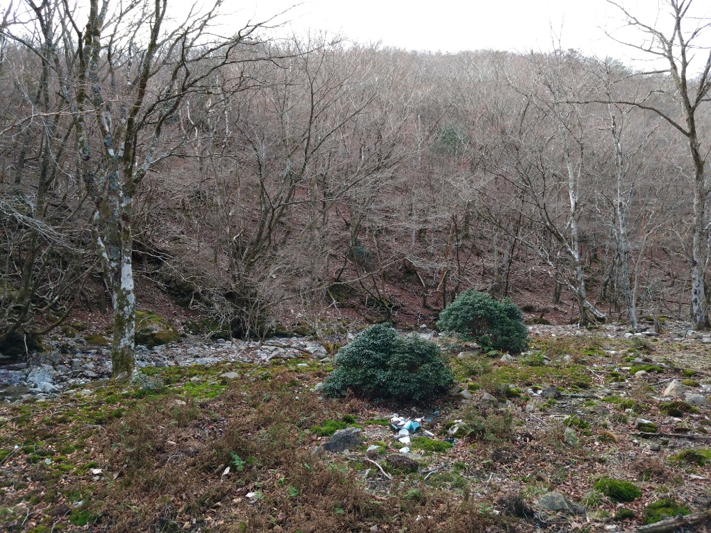 グーさん、この辺でテント張ったのかな。お茶碗のかけらを集めてここに置いたのもグーさんかな。