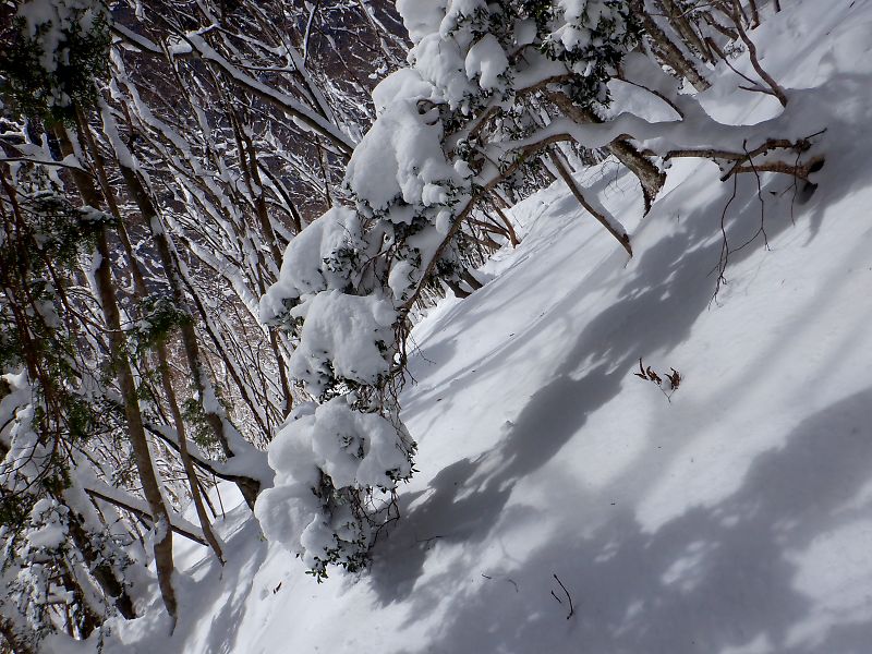 テープ道の西の尾根を下るが杉の枯れ枝にスノーシューが引っかかり難儀する。