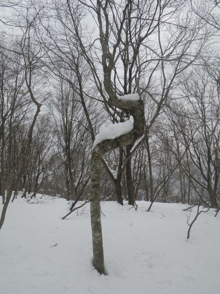 おおむね広い尾根が続き、時々尾根上に窪地ができている。雪は重いが、のんびり歩くことができる。