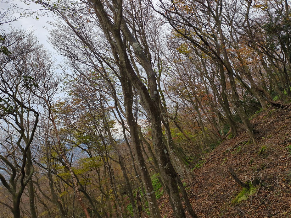 1時間ほど登ると案の定ポツリと降り出した。山頂に近づくにつれ風も強くなりレインウェアを着る。