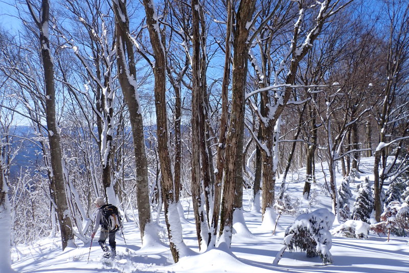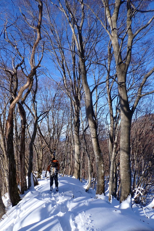 720mピーク下のブナの木々が立ち並ぶ緩やかにうねる斜面は、こころ躍らせるものがありましたね。この日のコースで一番いいところでした。