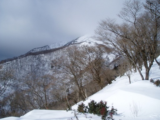 急斜面をこなし尾根の肩に出ると展望が開けて竜山頂が見えた。