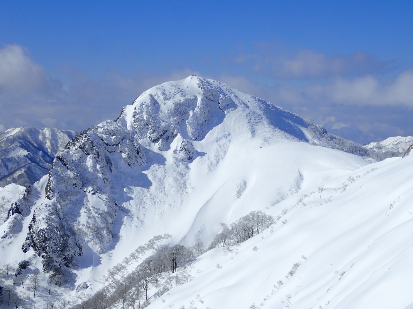 素晴らしい真冬の山ですね(^O^)/ しかも好天。6枚目なんかヨーロッパアルプスと勘違いしそうです。これぞ奥美濃のマッターホルンだ!登るにつれ天気が良くなってきた。標高1200mからは気持ちのいい稜線歩きとなる。冠山が格好いい。