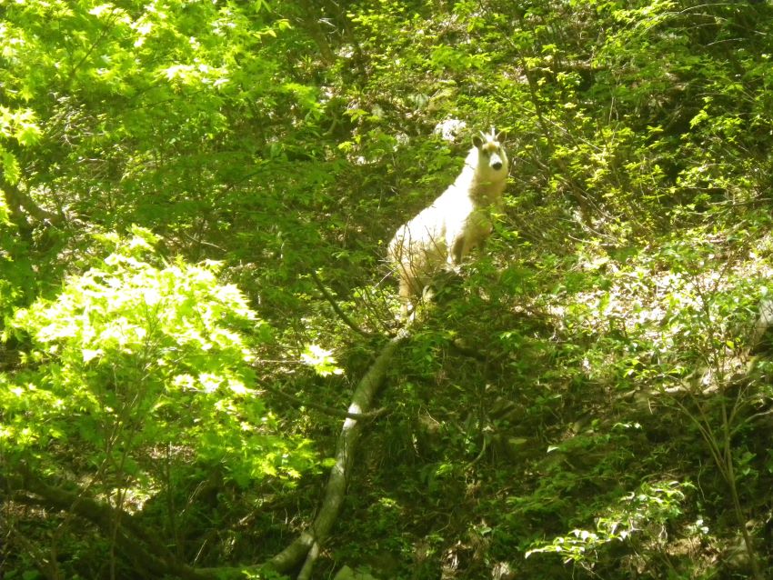 残置されたブルーシートやロープは何箇所かで見た。踏み跡も結構明瞭にある。とはいえ、靴の跡はあまり見当たらず、シカのひづめの跡ばかりが目立つ。白い尻を振って逃げるシカだけでなく、まだ冬毛のカモシカも、夏毛になったカモシカも見かけた。タカが大きな羽音を立て飛び立つ。