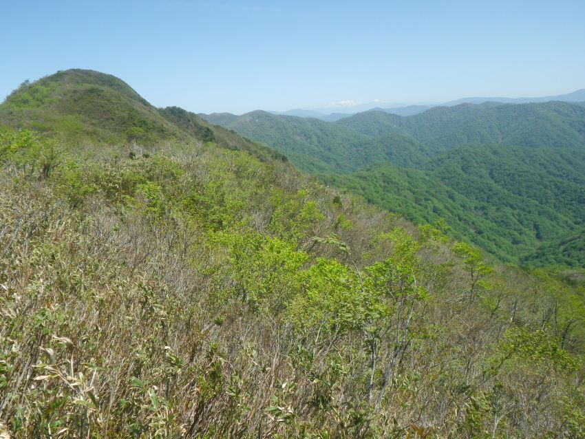 谷にいる間、笹ヤブはほとんどなかったが、稜線に出ると、笹やシャクナゲでうるさくなった。イワカガミが咲き、タムシバが咲き、シャクナゲやツツジも咲く。