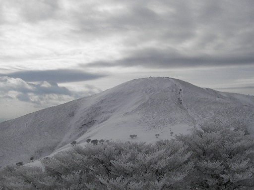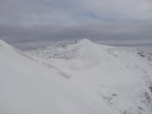 もうちょっと青空が出ていると良かったですね徐々にきつくなる尾根を我慢して登っていくと山頂域の南端の肩に着いた。後は山頂域の雪原をゆるゆる歩いていくだけだ。
