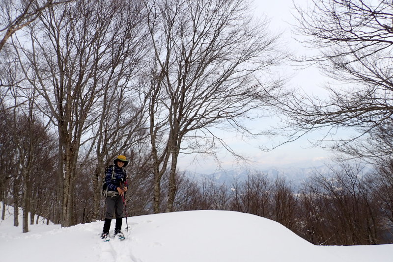 積雪は少ないが担いでいるよりはマシということでスノーシューを装置。緩い勾配を一定のペースで歩けるの