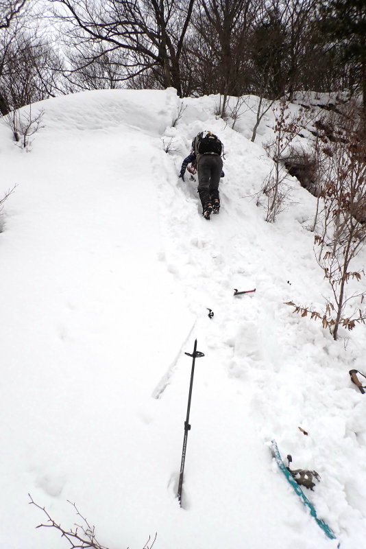ストックとスノーシューを投げ落として下降。滑っても雪がクッションになってくれる。