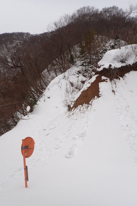 真下に林道が見えると果せるかな、5mほどのガケになっていたが、雪が積もっているのでなんとか下りられそうだ。
