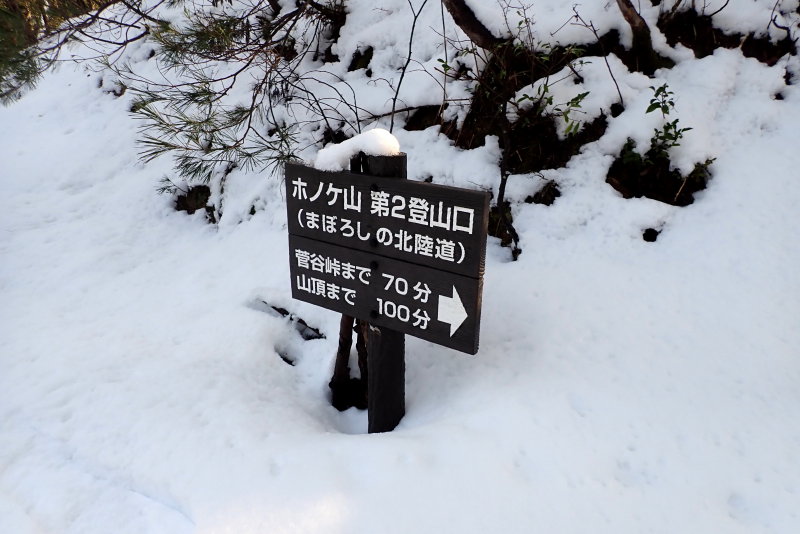 国道305号脇の除雪地に駐車。ホノケ山トンネル方面に少し歩くと「ホノケ山第2登山口」の看板があった。