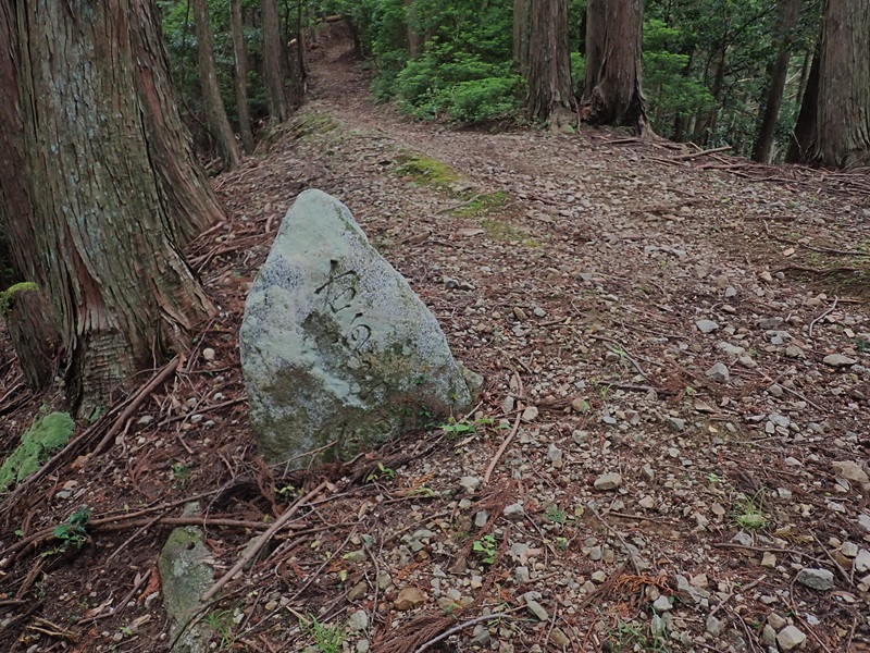 赤坂峠を越え神路山のはずれの「右あららぎ」の道標より取りつく。立派な溝道が続いており、谷に下る道との分岐にはあららぎ道の道標が2か所立っていた。驚いたのは石畳道の区間が2か所あった事だ。深野にあった眼科医院に通うために一志方面の人たちが通ったことから「目医者みち」と呼ばれただけのことはある。明治時代には電報配達の人が山を越え、昭和30年頃まで牛が通っていたそうだ。