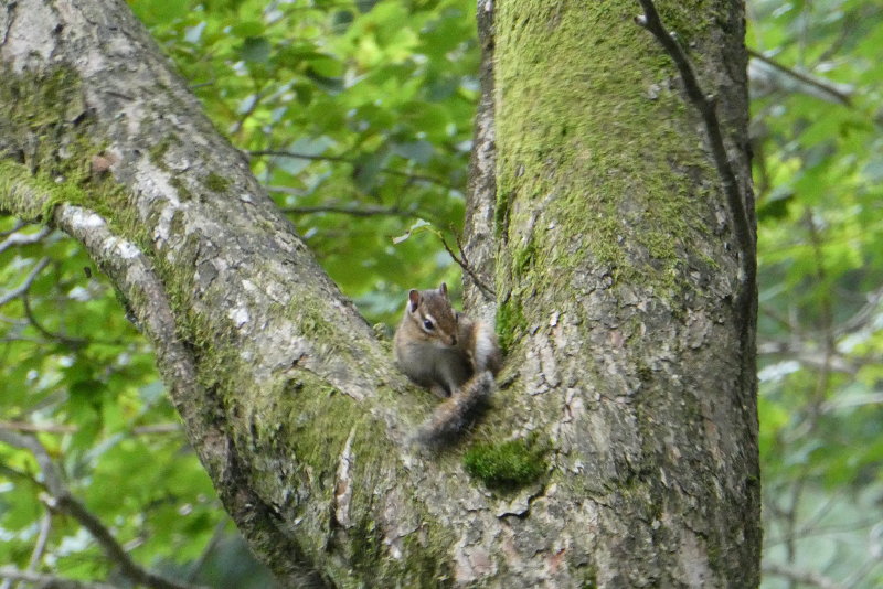 前を歩いていた登山者がカメラを構えている。どうやら前方の木の高いところにリスがいるようだ。