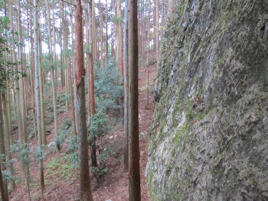 諾炬羅山の北峰まで行って、谷へ下降した地点に戻り、ここからゲジマークの確認に向かいます、初めのうちは岩場も大した事なく上にも抜けられそうです、植林帯では背後の高い壁となってました、懸垂の練習するのには良いかも?
