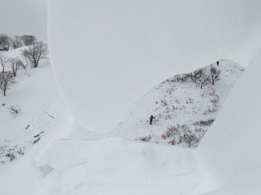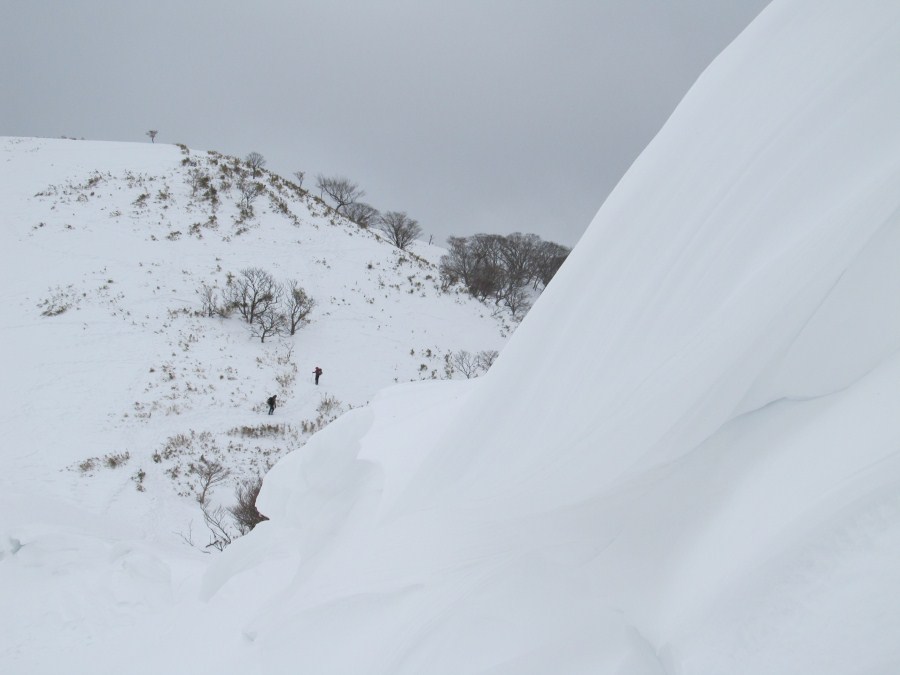 ワカン持ってても付けないひと多いですね、スノーシュー付けると道を外して歩き回りたくなりますよね、ホタガ谷源頭部の急斜面もトラバースしてみたけどライトニングのトラクションはいいですね、雪庇にも直登してしまいました :D