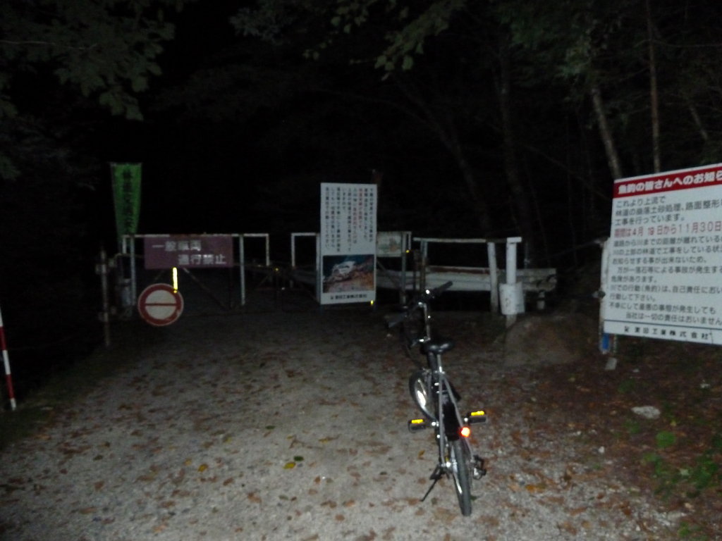 DOCを押してゲート脇の通路を通るが狭い。明け始めた空はヘッデンが要るか要らないかという暗さだ。未舗装の林道