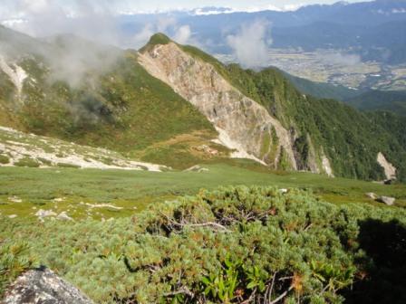 にそよそよと吹く風が心地良い。空木岳は雲の中。赤梛岳と百間ナギの強烈なガレが目を引く。