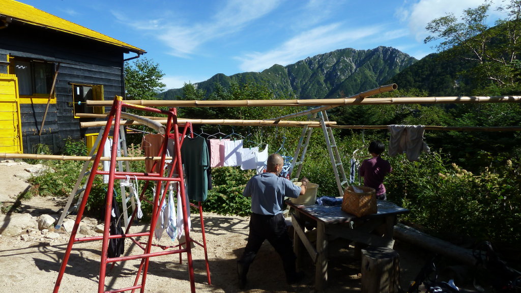 越百小屋では小屋番夫婦が干し物の真っ最中だった。「ゆっくり休んでいって」と言われてザックを降ろした。
