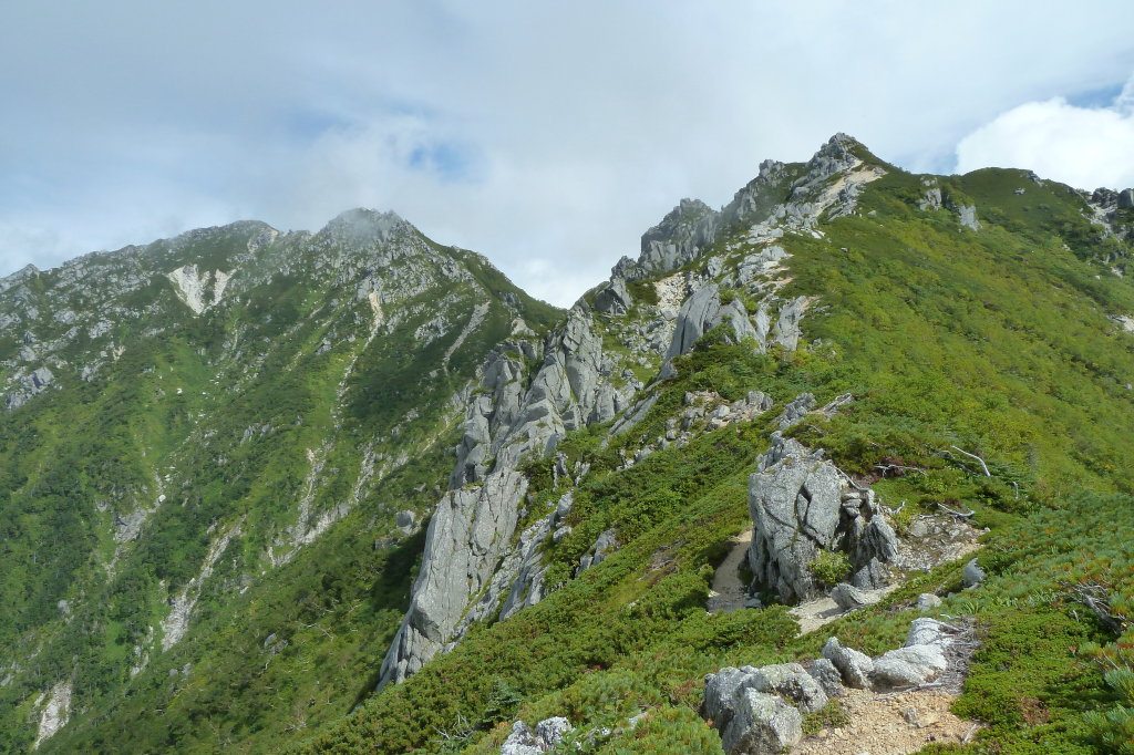 手前から見ると、最低コルから南駒ヶ岳までは岩稜が続いている。さて、どんなルートだったかなと考えるが思い出せ