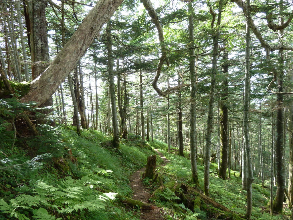 この登山道は全体的に鬱蒼とした針葉樹林の中を行く。花も展望もなく、ただひたすら高度を稼ぐだけの面白みのない
