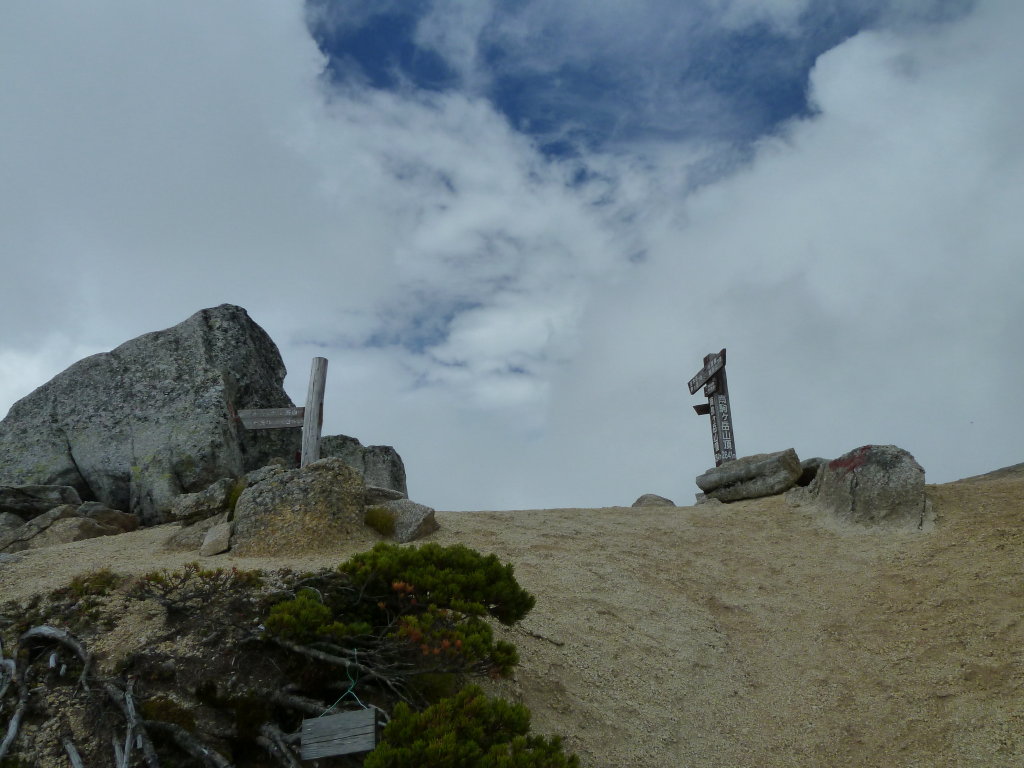 やっとの思いで越百山頂に立った。今日は晴れているもののかなり雲が多く、御岳も見えない。南アルプスも鋸あたり
