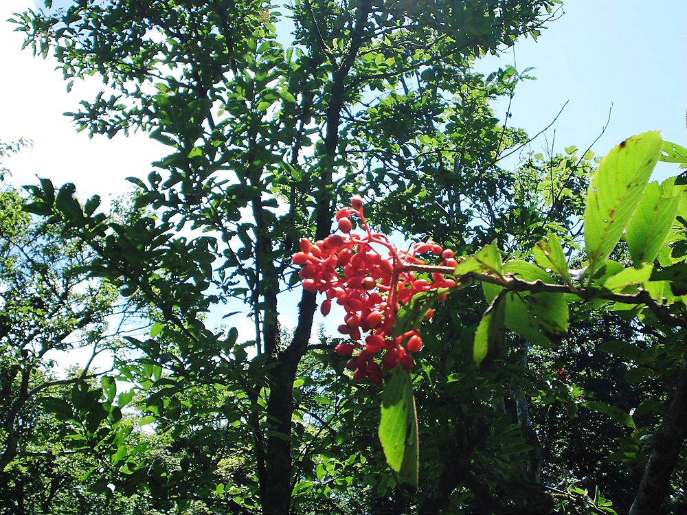 奥の平入口に立つブナ樹、マユミの赤い実たわわに付けた木がアクセント。
