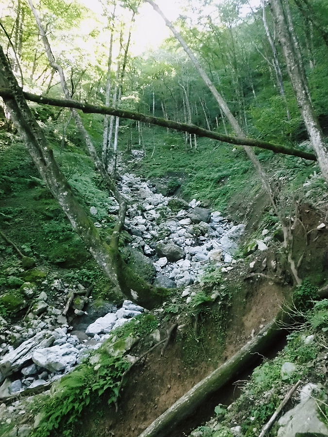 ムカシに地底への穴が開いた所、岩屑で埋まり普通の谷に水はココで地底に吸い込まれてる。