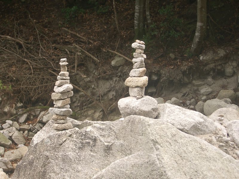 朦朧として南峠と段木の中間あたりの無名ピークに辿り着いた。段木から帰るか、南峠から帰るか思案する。やはり冷たい水場がある南峠から下りよう。水筒の水はヌルくて駄目だ。中峠・南峠分岐で美味しい水をたらふく飲んで生き返る。下りでまたたくさんのケルンを見る。自分も作ってみようと言う気になって積んでみた。格好の石がたくさんあるので7、8段ならすぐできる。しかし安定感はあるが芸術性に乏しいなと思う。次回の課題だ。駐車地に16時半ごろ着いた。久々の山行はずいぶんスローペースだった。