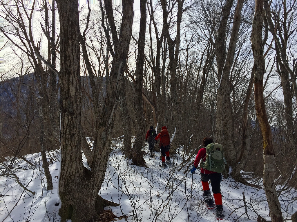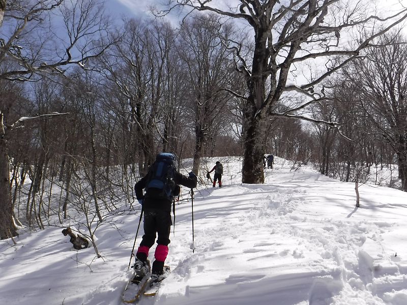 舗装道路を歩き、無舗装の林道をしばらく歩き、尾根尻に着く。道には雪はほとんど無い。山斜面には少しだけ雪がある程度。やぶと言うほどではないが、登山道という感じではない。でも、道はついている、とのことだ。1時間ほどで956.6m三角点に着く。ここを越えると雪が繋がって来た。標高1000mを越えたところで、スノーシューを装着。登るにつれて、だんだん雪が増えて来た。ただ、低木の細い木が出ていて、時々、顔にピシッと当たり痛い。