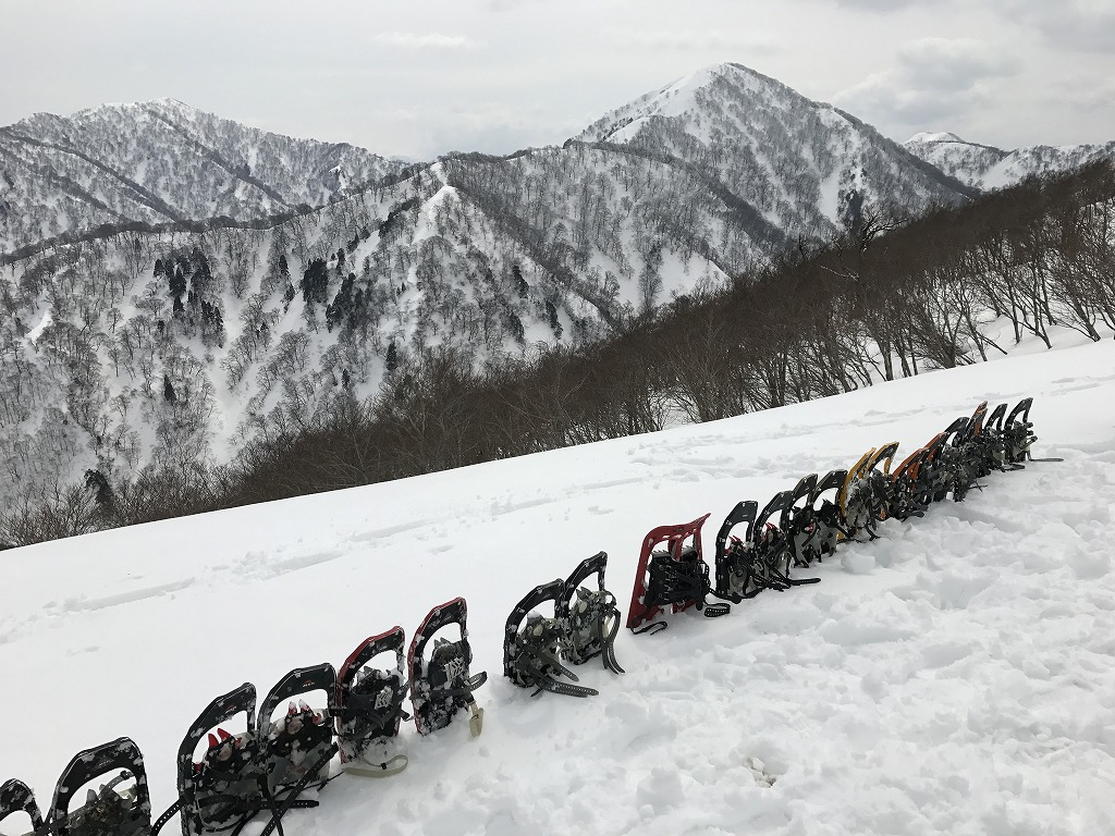 12時少し前に、三角点1,620.3mの手前に着く。大きなブナの前。白山のよく見える、ランチ場だ。いつものようにスノーテーブルを作る。稜線上で少し風があったが、全く寒くない。いつも以上に、ゆっくりランチ。白山をバックに、いつものようにスノーシューを並べて記念写真を撮る。