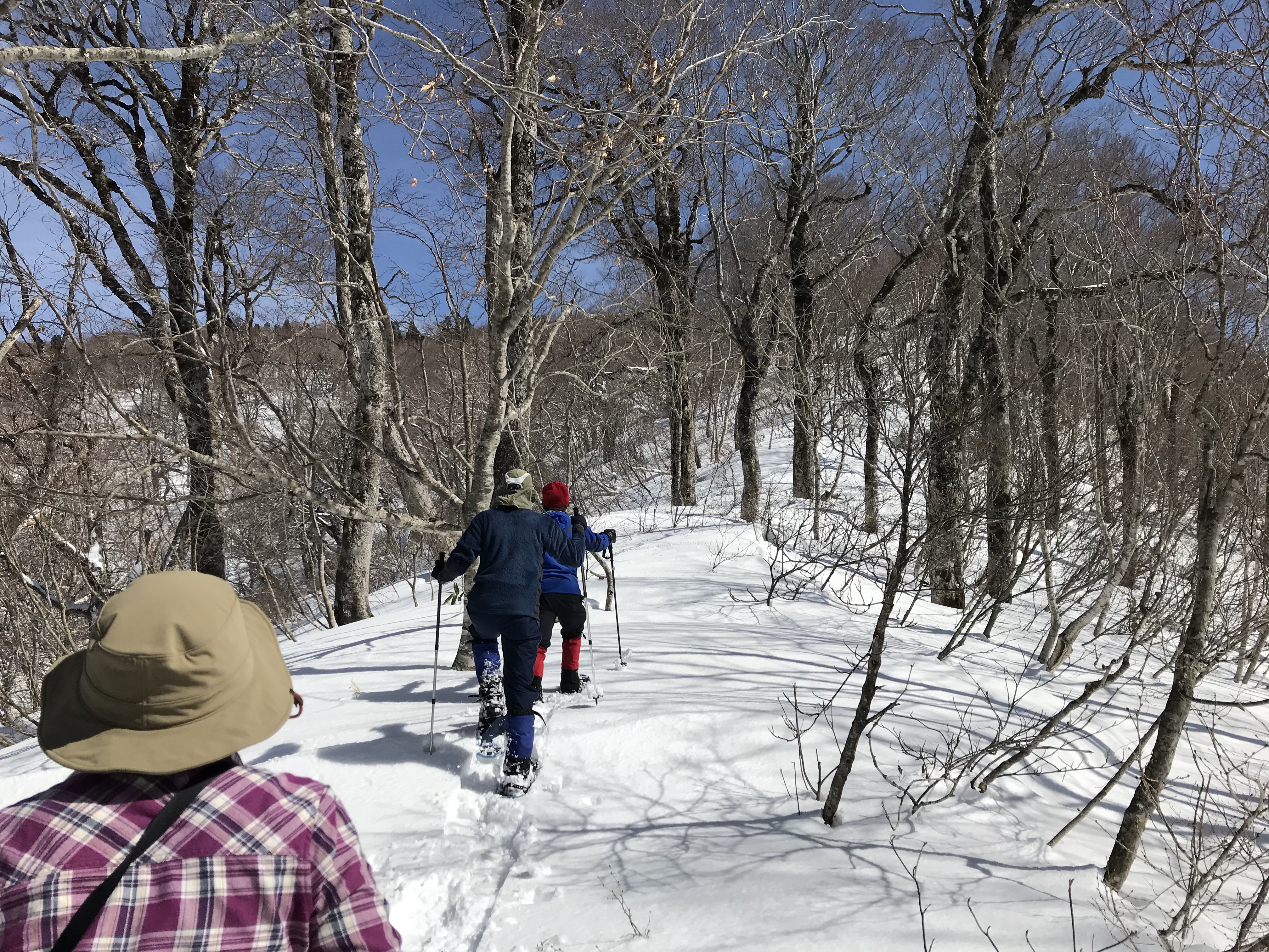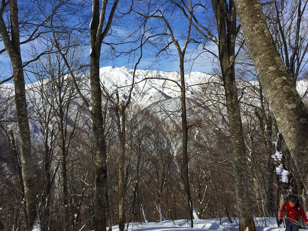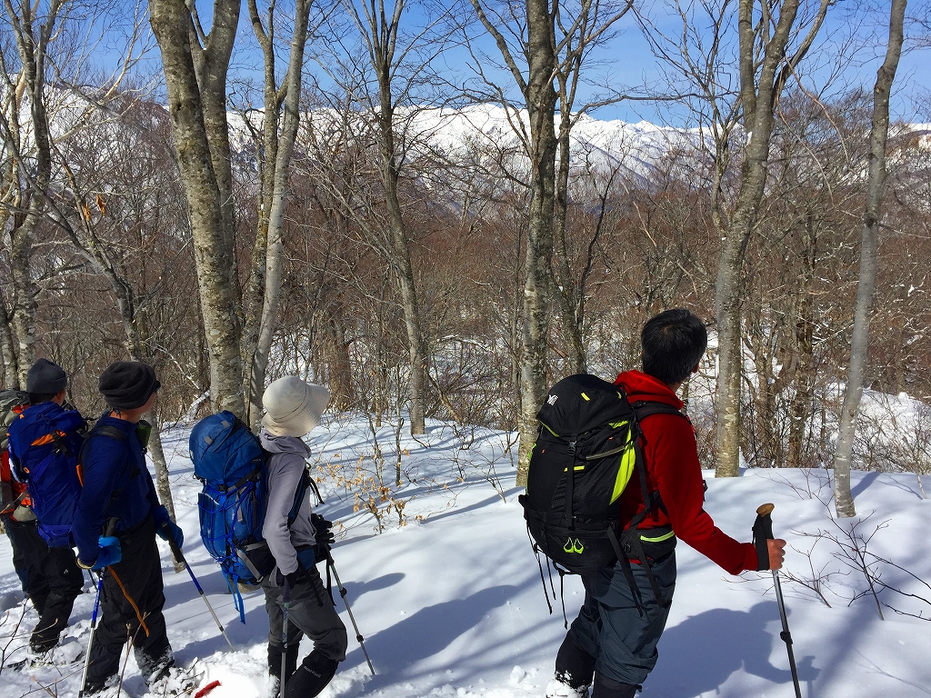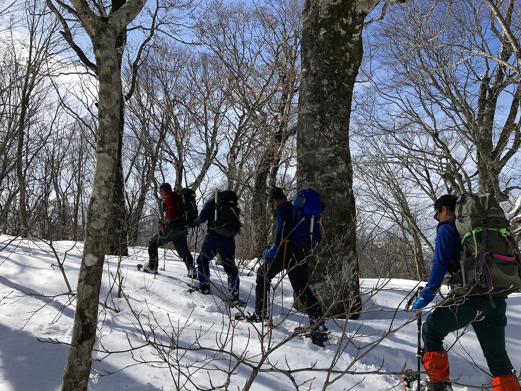 おかげで山仕事で使われていた尾根の雰囲気を味わうことが出来ました。雪が増え、ブナが現れてくると、青空も広がってきました。