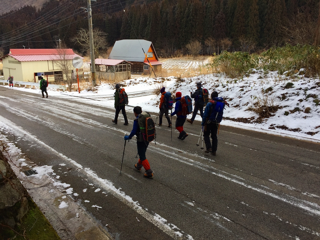 朝5:00過ぎくらいから、それらしき人影があり、6:00には、全員集合する。ここから4台に分乗して、飛騨白川郷、白弓スキー場に向かう。国道156号線を北上し、御母衣ダムを越え、白山平瀬道登山口に向かう道に左折するところで、今回は右折して、庄川を渡り、白弓スキー場駐車場に着く。駐車場に全く雪は無い。山も白くない。準備していると、「スノーシュー持って行くの?」とか、「スノーシュー、ザックにくくらずに手で持って行けばいい?」とか、いやみな質問が飛ぶ。