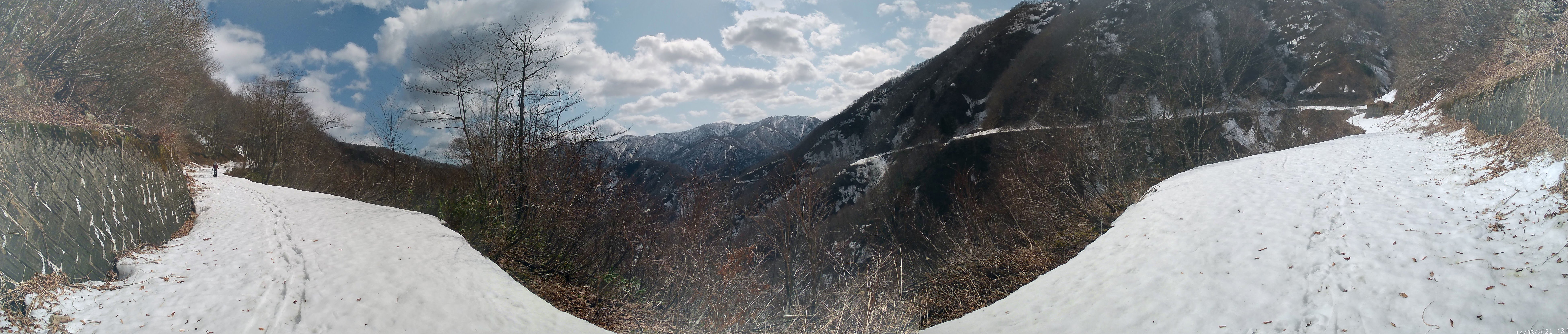 標高660mあたりの景色 地形図上の標高960m地点の近くあたりから、林道が斜面と一体化してるところが峠まで延々と続いていて トラバースするのが嫌らしいんで、林道法面から尾根に取りつきましたが、標高960m地点から北側の尾根に雪が無く、まだ葉がついてないとはいえ密度の高い藪で、降りれたとしても戻ってくるのは かなり時間がかかりそう、ということで、他色々考えましたが、ハード系は避けて引き返すことにしました。