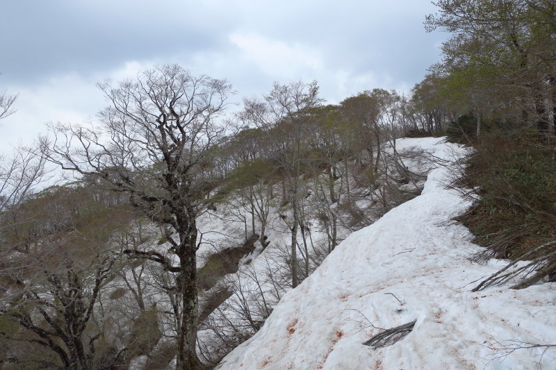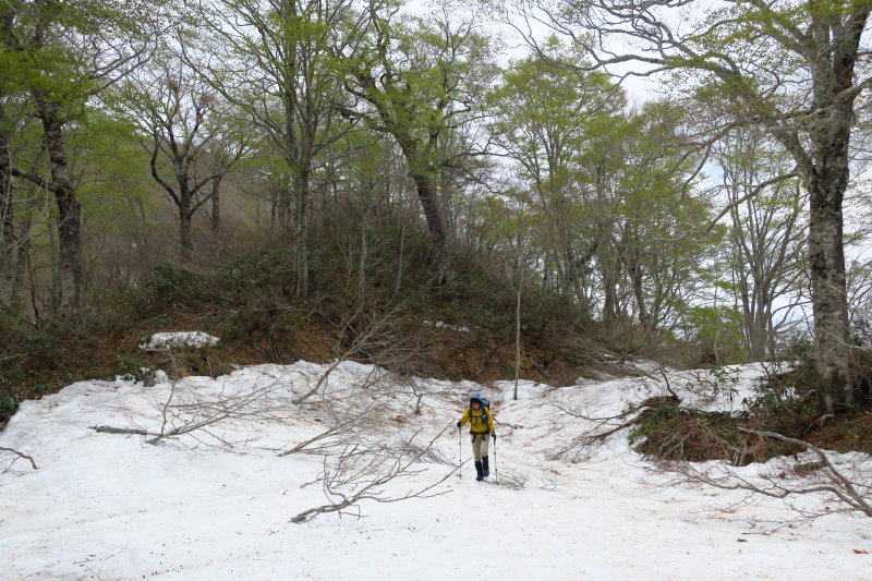 ルンルン気分で辿り着いた・1530。でも、その先、たんどう谷左岸尾根にはほとんど雪が残っていなかった。うつくしいブナ林にはササと灌木が飛び出していた。