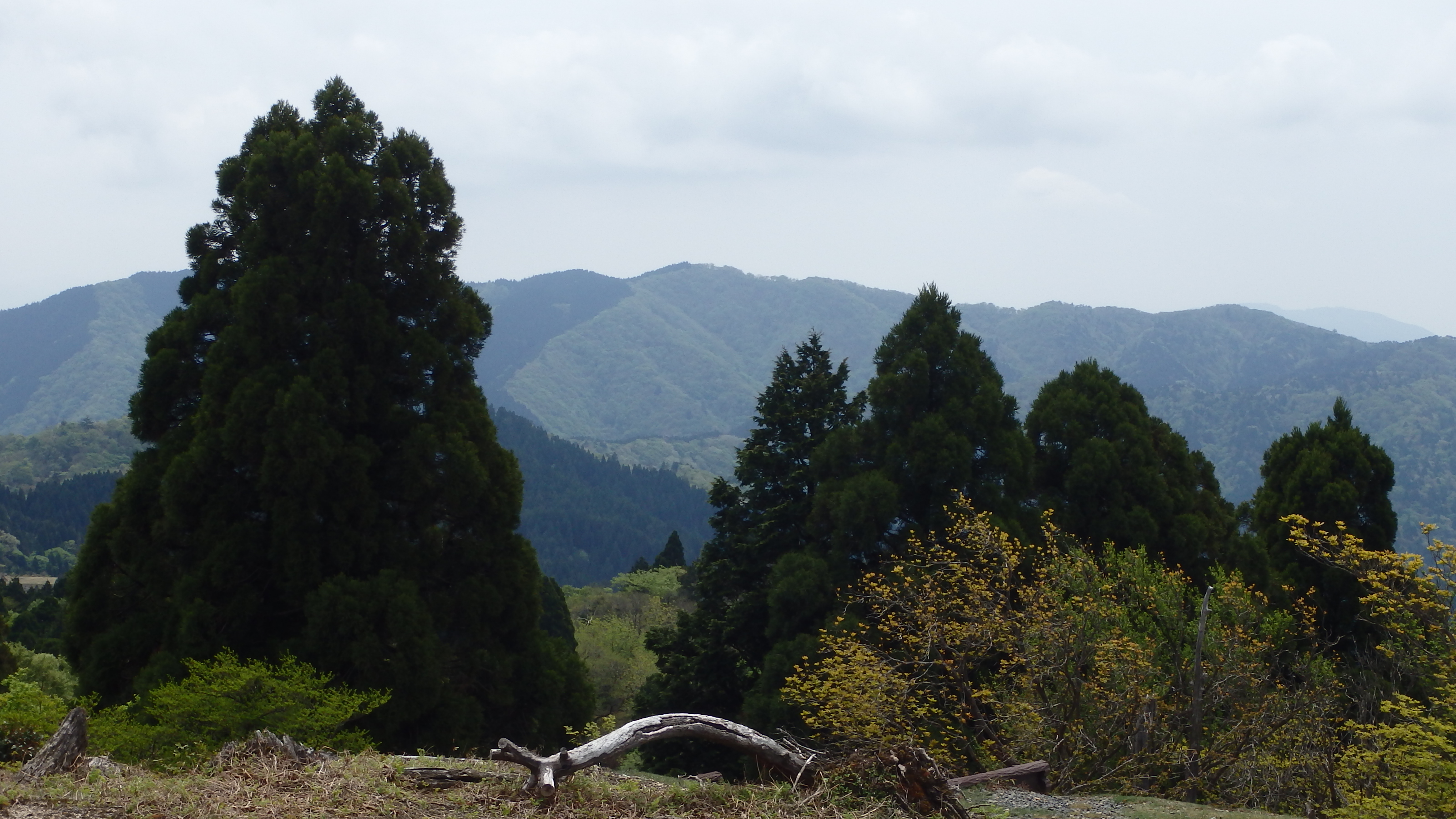 山頂からは南側の眺望が開ける。目の前の稜線のピークは皆子山971.5m。京都府の最高峰だ。 その左奥に比良山系の蓬莱山などが望めるが、それ以上は樹木で視界が閉ざされる。