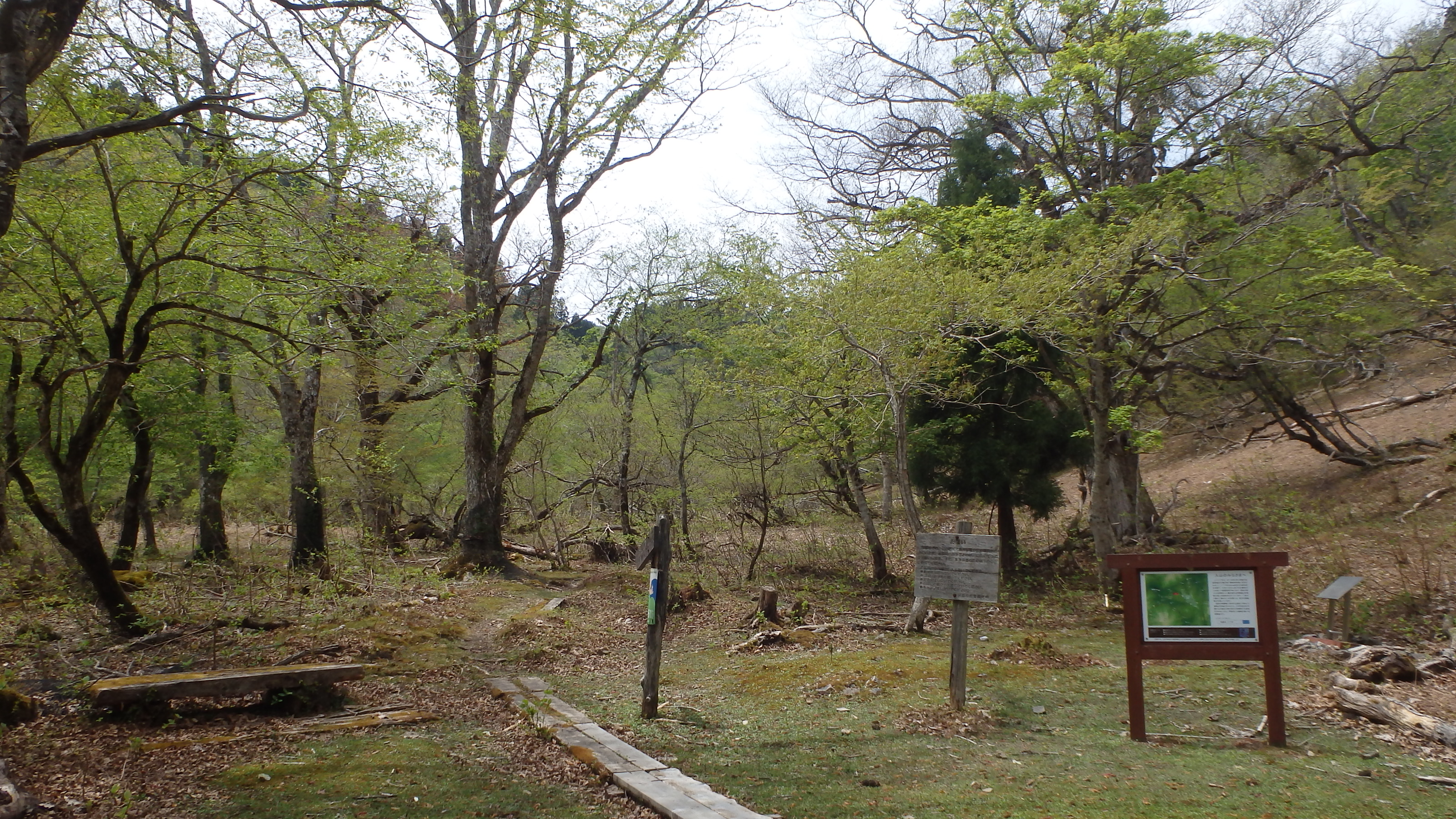 クラガリ谷は最初が急斜面だが階段状に整備されている。すぐ湿原の一部のような平坦湿地を進むと湿原周回路との合流点に着く。遠い過去には近くにスキー場や新心荘という建物があったという。ちょうど正午だ。木道やベンチがあるので、ランチにはもってこいだ。 八丁平高層湿原は林道建設計画から自然環境を守る市民運動が広がりルート変更されるなどの歴史を経て2016年に「京都丹波国定公園」に指定されている。